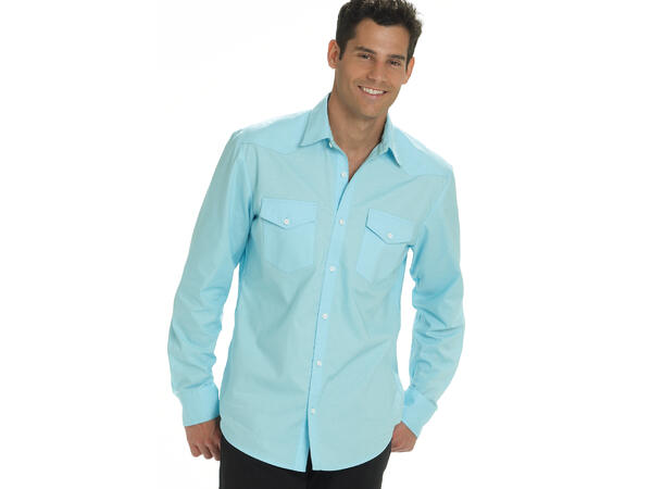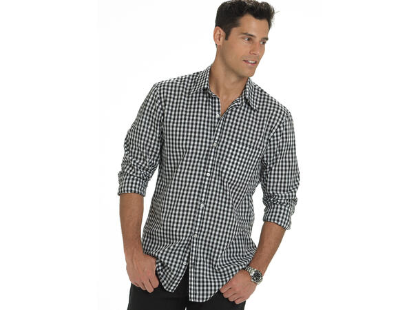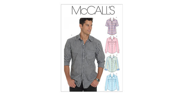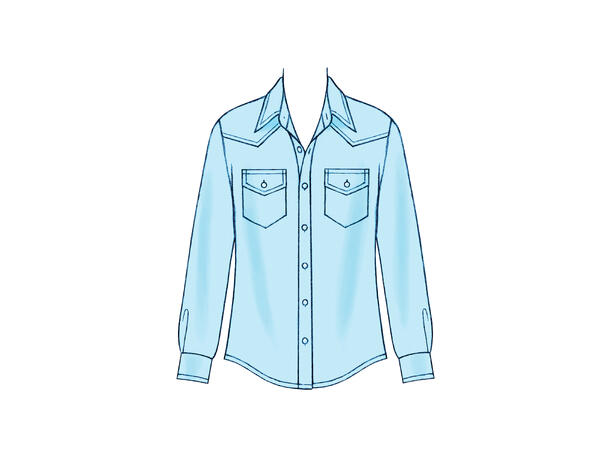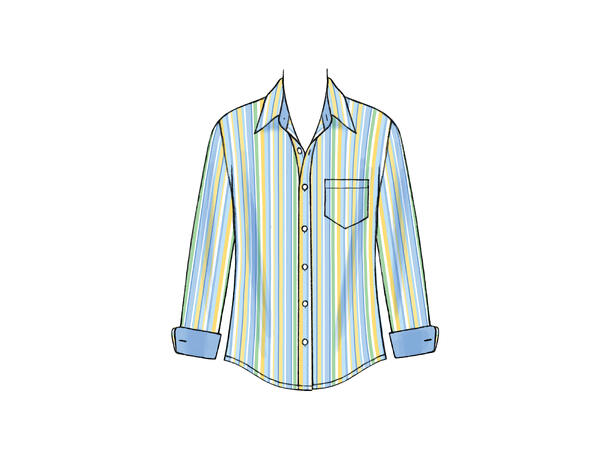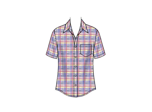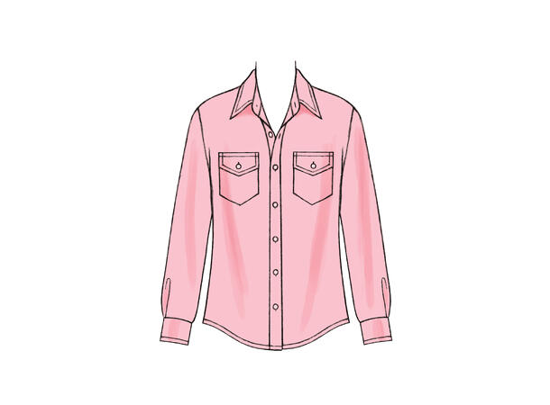 Alle skjorter har krage, lommer og ermevariasjoner. A har korte ermer, B-E har lange ermer med mansjett, B har kontrast i kragen.