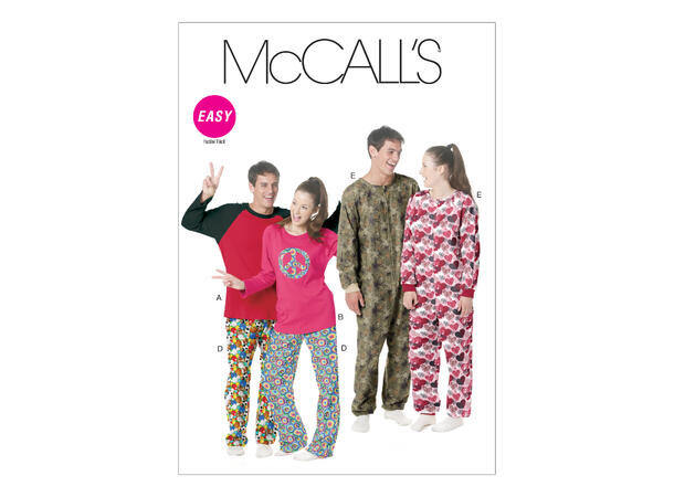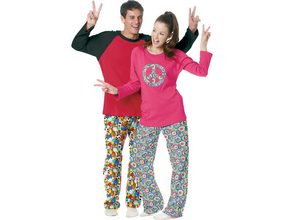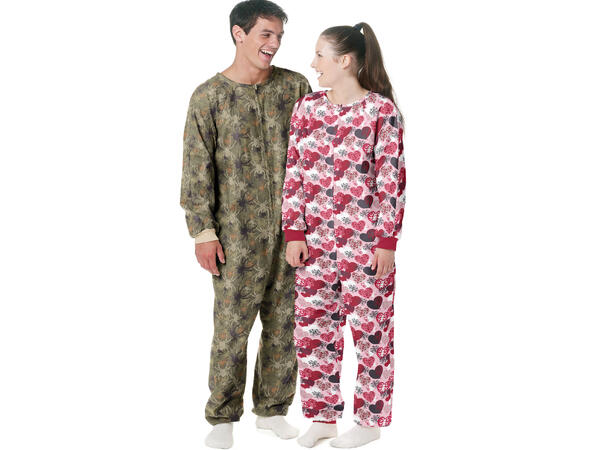 Pysj med onstrastoffer, sydde falder og bukse med strikk i midjen. Jumpsuit/kosedress har glidelåslukking foran. Paaser til unge voksne/tennåringer og voksne.