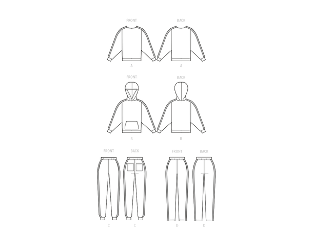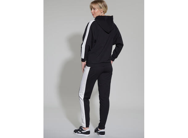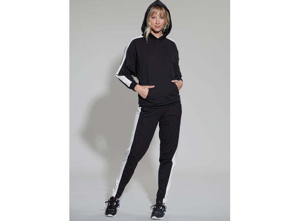 Loungesett bestående av genser, hettegenser og bukse med kontrastfarge i sidepanelene. Hettegenser kan lages med frontlomme og buksen kan lages med eller uten lommer bak