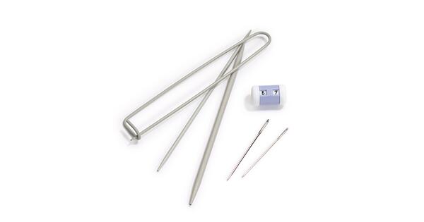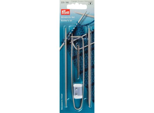 Dette settet inkluderer et bredt utvalg av det viktigste strikketilbehøret du trenger for å fullføre ulike prosjekter. Det inkluderer to strikkepinner, (en stor og en liten ), en maskeholder, to garnnåler, og en masketeller. Alt er produsert av Prym.