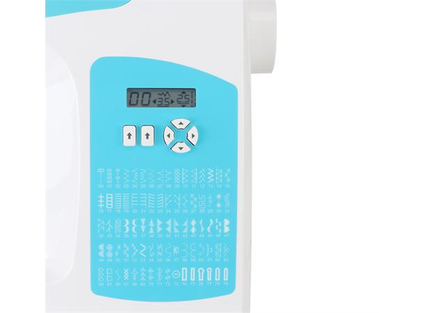 80 innebygde sømmer, 6,5 mm sømbredde, 6 helautomatiske balanserte 1-trinns-knappehull.