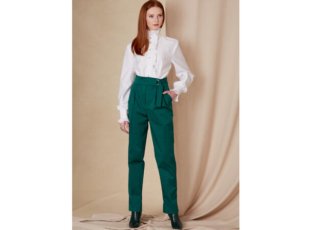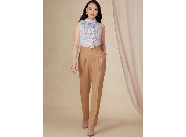 Ankellange bukser med litt avsmalnende passform, høyt liv, folder på forsiden, lommer i siden og gylf.