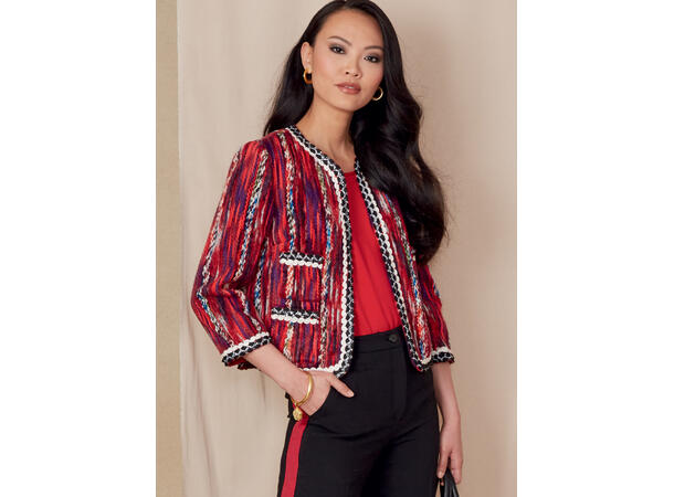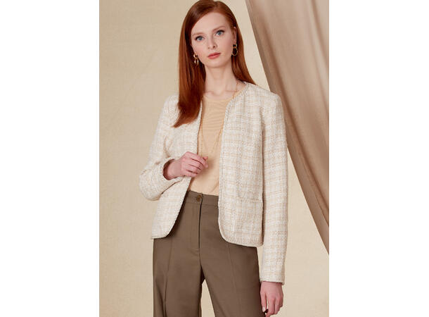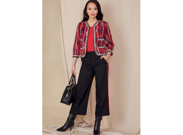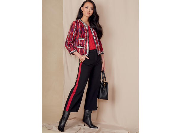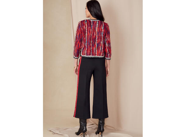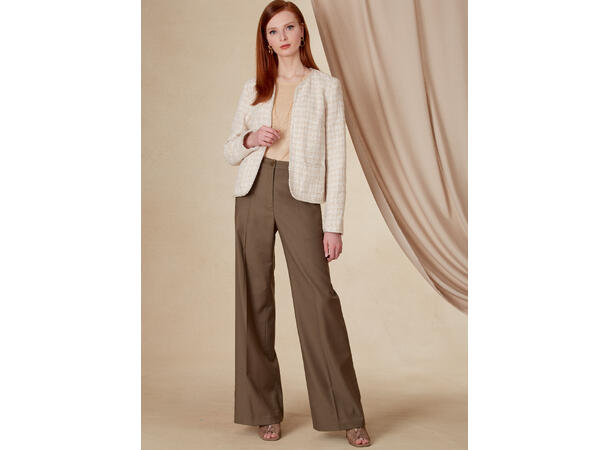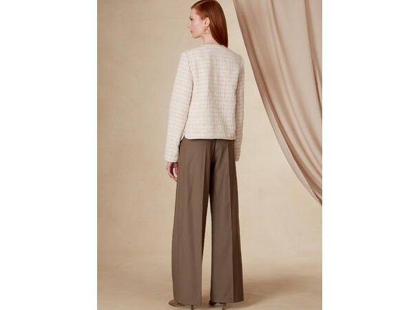Formsydd og fôret jakke med flettet kant, formet splitt, insnitt i bysten, lommer. Vide bukser, semi-tettsittende over hoften, vide bein, sidelommer, gylf, lengdevariasjoner