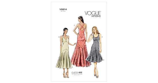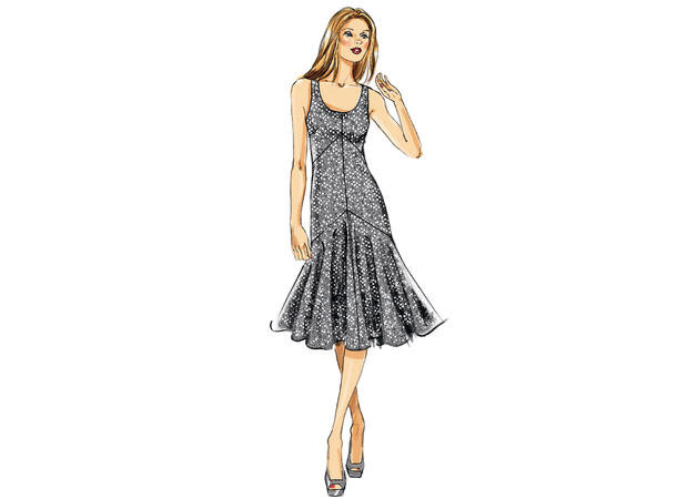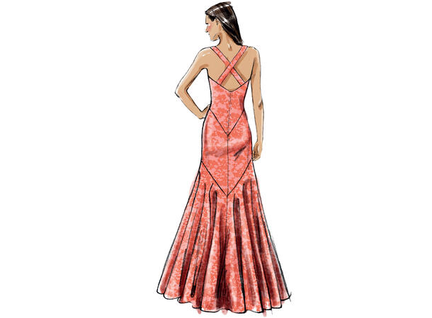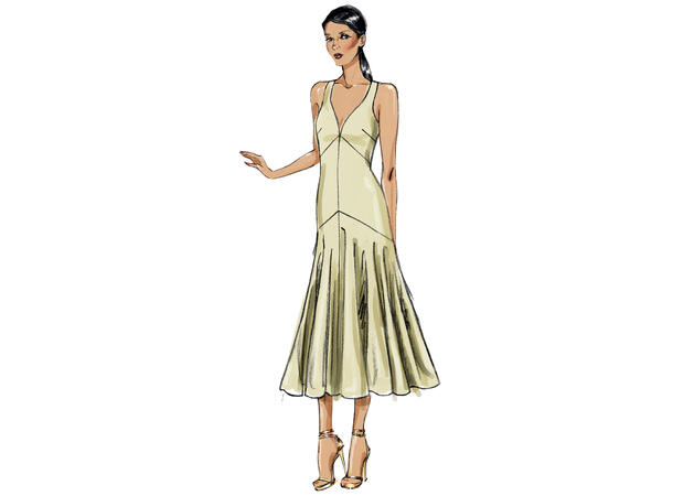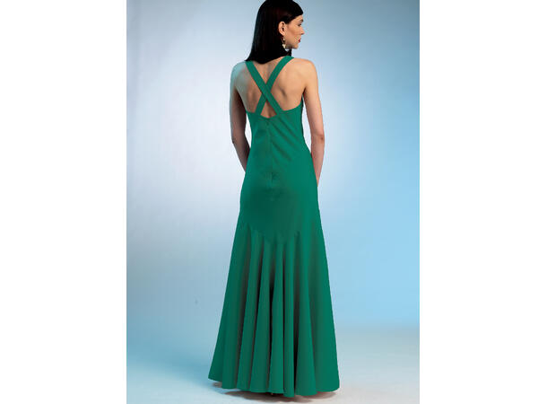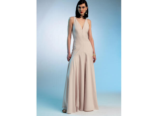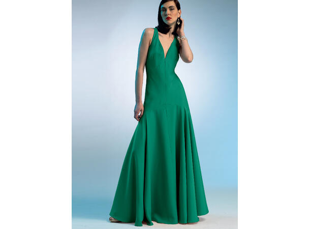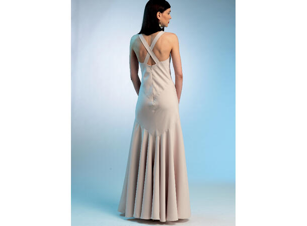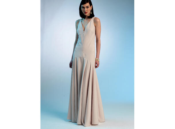 Föret kjole med halsvarianter, skråklipt bunn, glidelås i ryggen og som kan lages i ulike lengder.