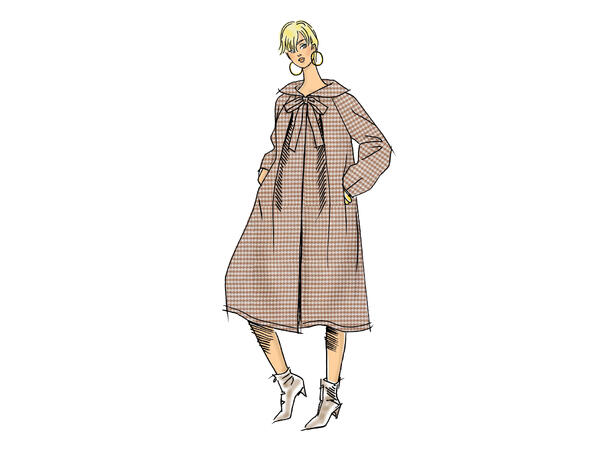 Veldig løstsittende kåpe med hette og knyting ved halsen. Lengdevariasjoner og lukning med trykknapp.