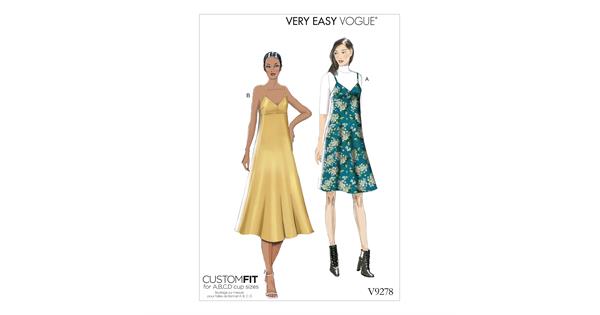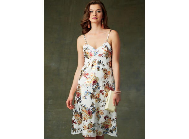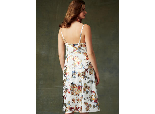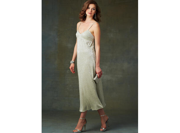 Fôret kjole som er ettersittende over bysten og gr over i et med vidt skjørt. Kjolen har spaghettistropper og kan lages i to lengder. Inkludert separate mønsterdeler for cup-størrelse A, B, C, og D.