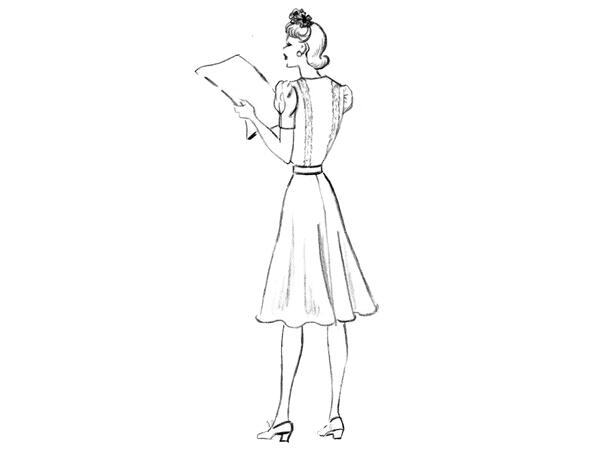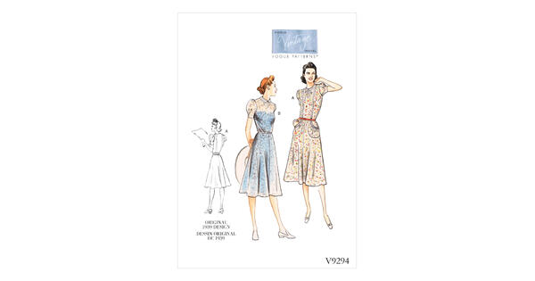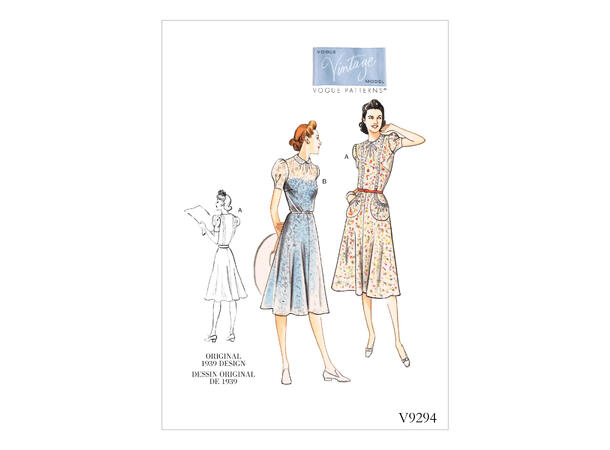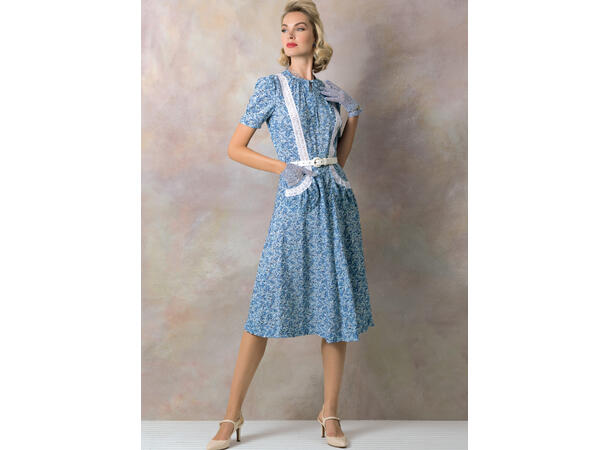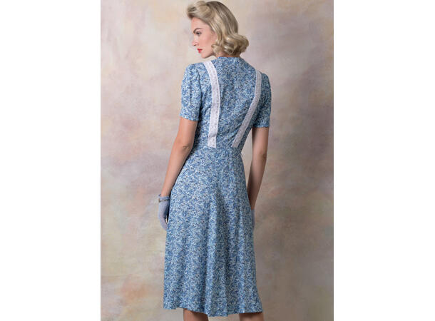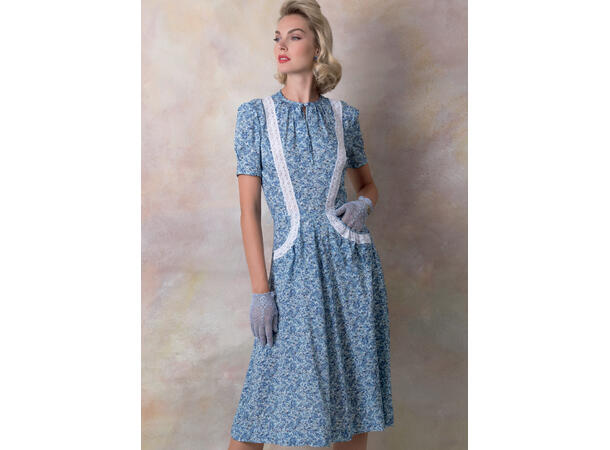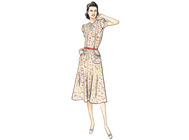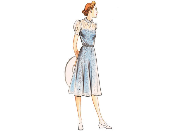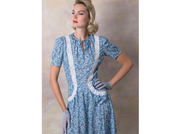 Vintage figursydd kjole fra ca. 1939. Kjolen har variasjoner i halsen, puff på ermer og sideknapper eller glidelås. Kan lages med lommer.