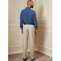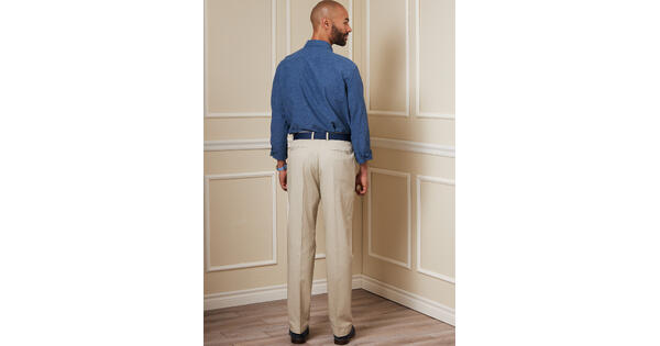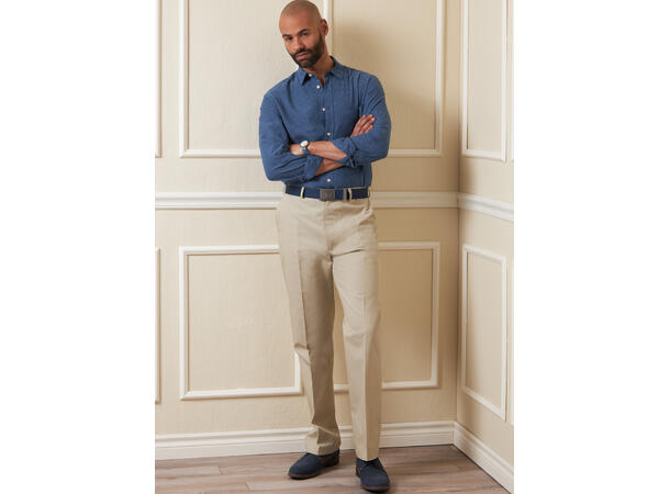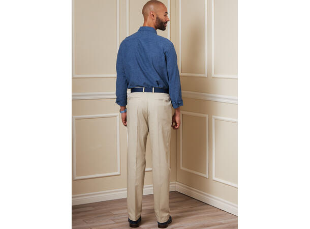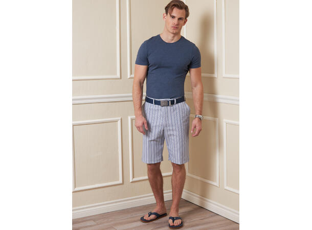 Shorts og bukse som har linning med hekte og glidelåslukking foran. Sydde sidelommer, passpolerte baklommer, beltehemper og sydde falder.