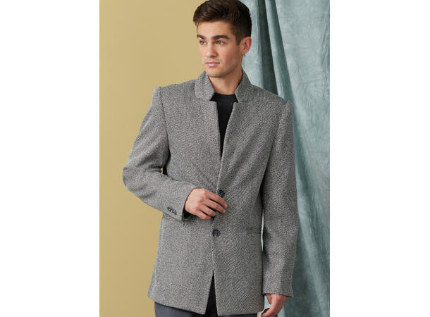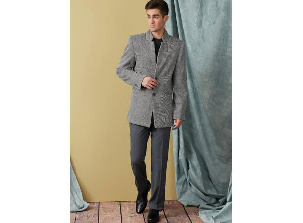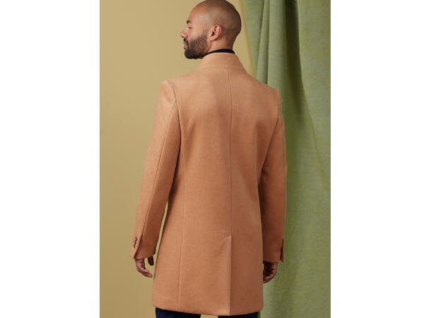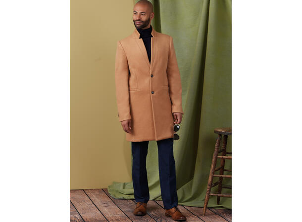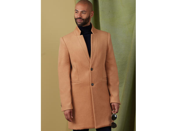 Frakk til herre som er helfôret, har krage og er litt slim fit. Den har skulderputer og passpolerte lommer.