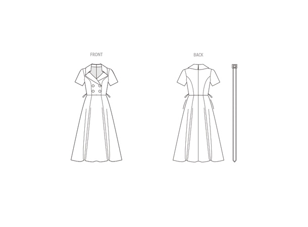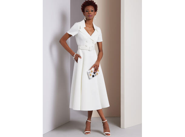 Fit-a-flare kjole som er fôret. Den er ettersittende over bysten, stor åpen krage og jakkeslag. Kjolen har belte i livet, et vidt skjørt og lommer i sidene.