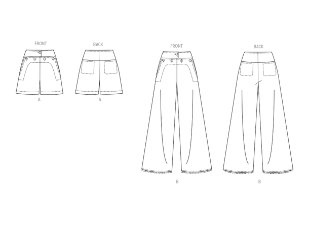 Bukse og shorts sitter etter over hoftene, har klaff foran med knappelukking, lommer foran og bak.